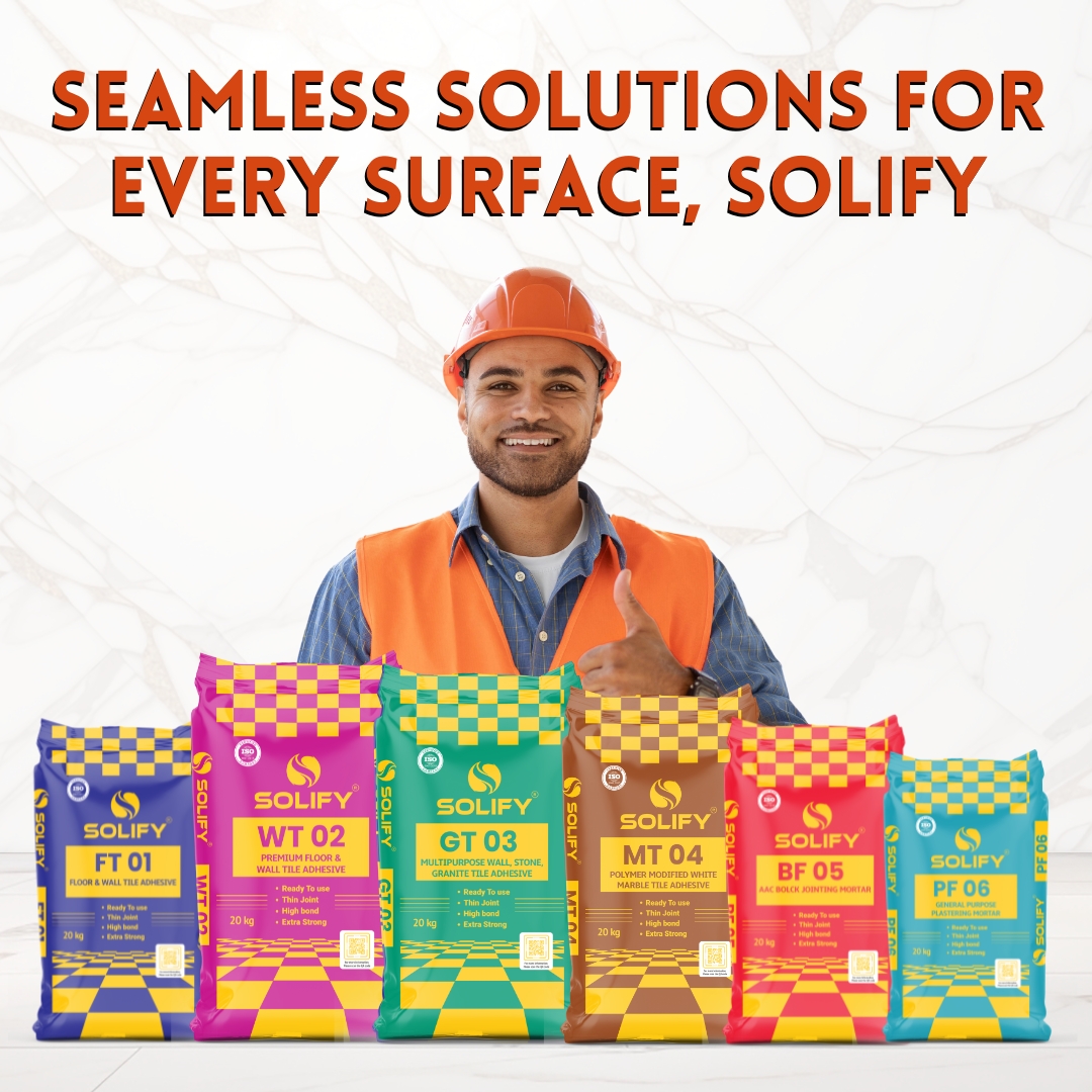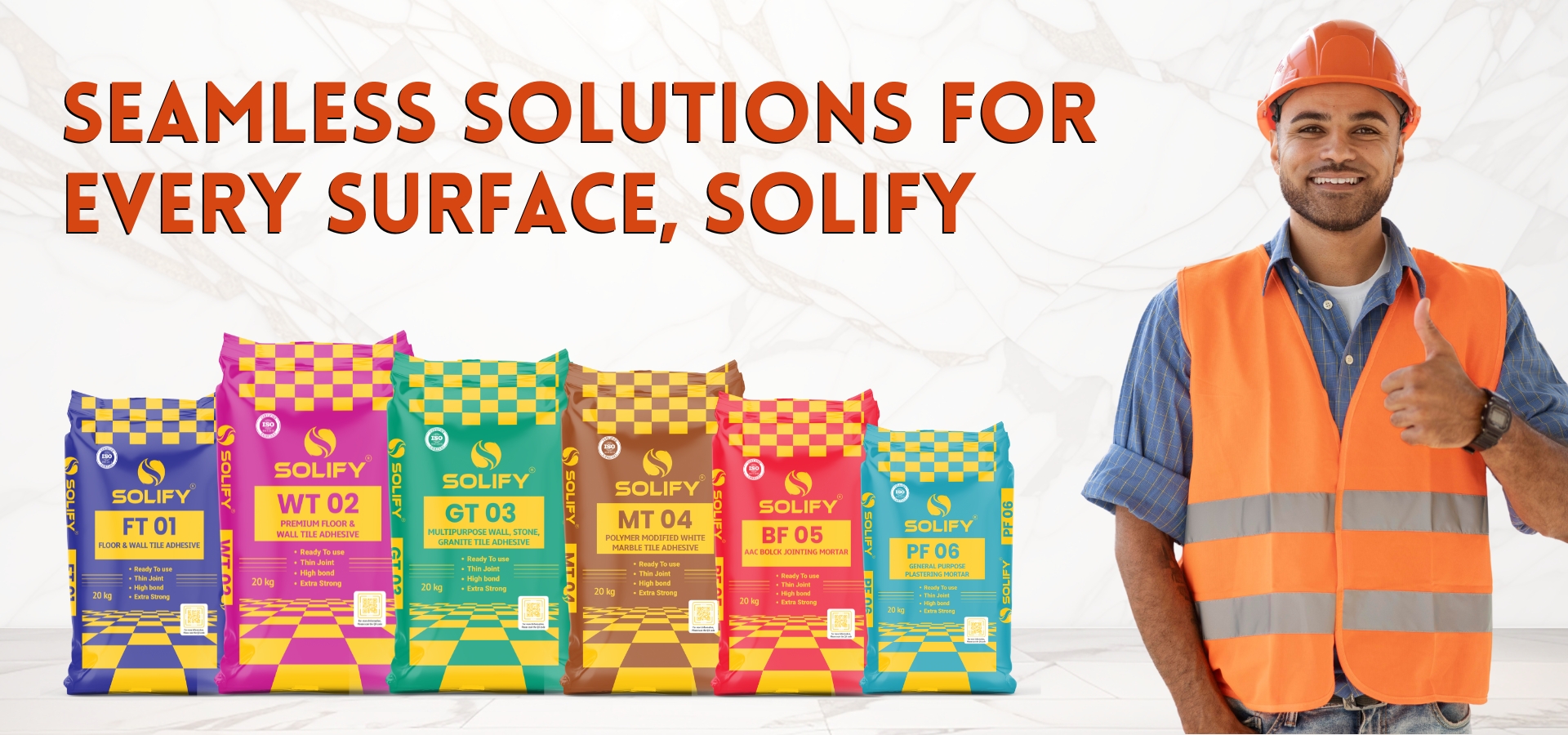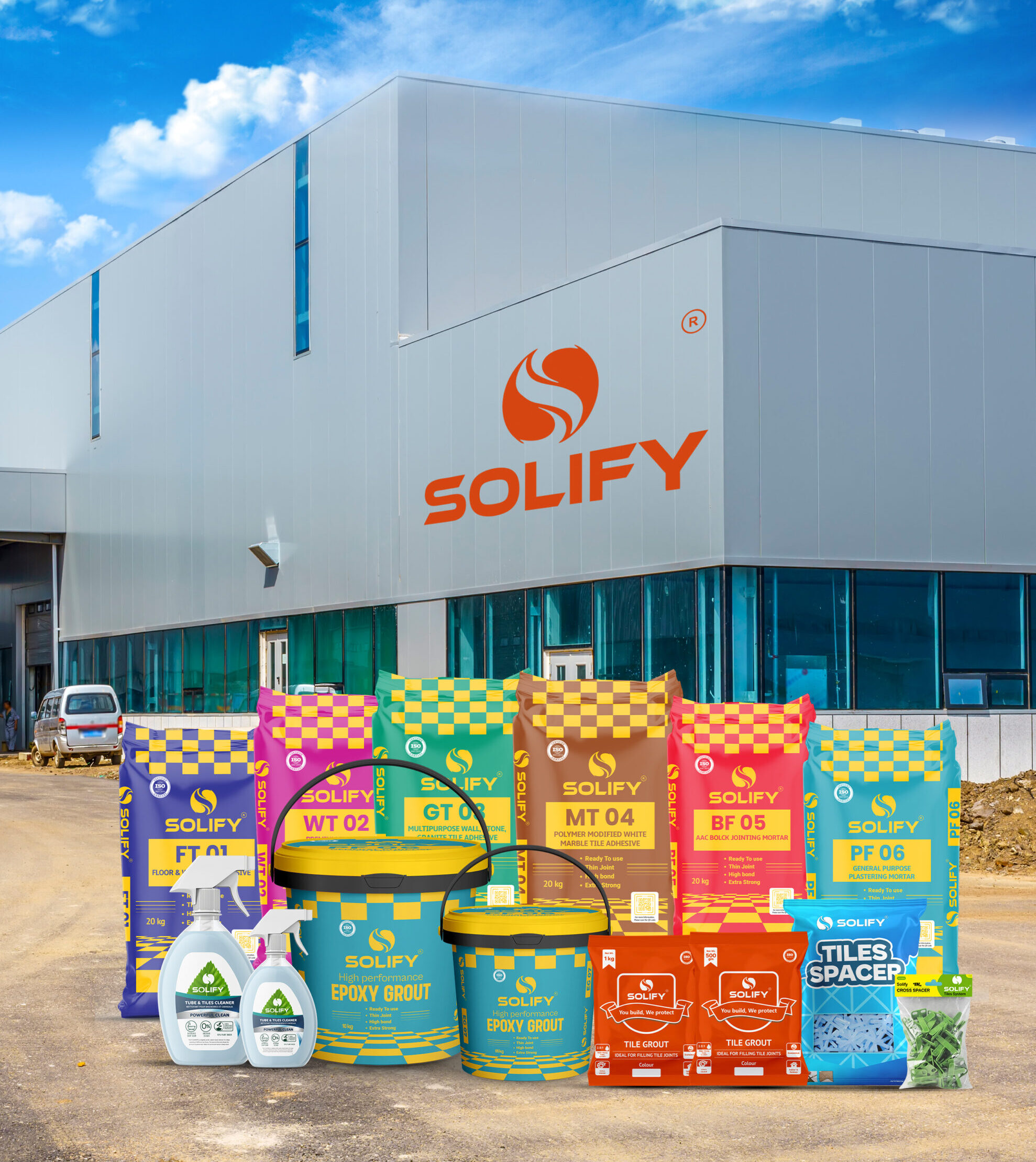 Solify, a leading brand in the Indian tile adhesive market, offers a comprehensive array of products tailored to meet various tiling needs. Our product lineup includes Multipurpose Wall, Stone, and Granite Tile Adhesives, Premium Floor & Wall Tile Adhesive, Tile Grout, General Plastering Mortar, AAC Block Joining Mortar, and Polymer Modified White Marble Tile Adhesive. Additionally, we provide tile cleaners, epoxy grout, and more to ensure a complete solution for your tiling projects.